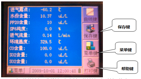 進(jìn)入“測(cè)量界面”后,軟按鍵有:曲線(xiàn)鍵、保存鍵、菜單鍵、幫助鍵。按動(dòng)相應(yīng)的按鍵可以進(jìn)入“曲線(xiàn)界面”、“保存界面”,“菜單界面”,“幫助界面”。同時(shí),你也可以看到露點(diǎn)、水份含量、壓力、流量、環(huán)境溫度、SO2、H2S、CO、PP20等測(cè)量值。