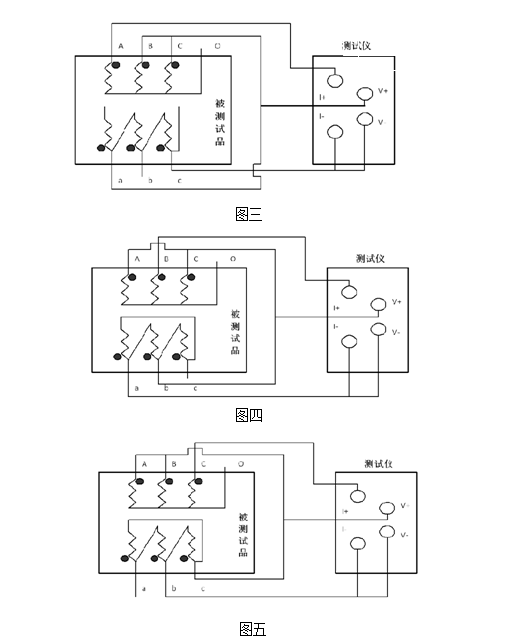 對于大容量的變壓器的低壓側測量時,如果在既有的情況下,直流電阻測試儀的最大電流比較小,或者為了加快測量速度,可選擇助磁法測量。上圖中,圖三、圖四、圖五分別為測量低壓Rac、Rba、Rcb的接線方法