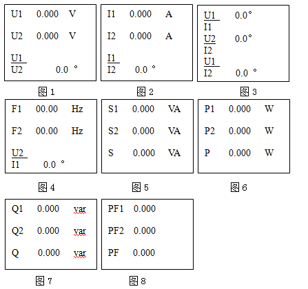 按下儀器開關(guān)鍵按鈕,儀器首先進(jìn)入電壓測(cè)量界面, 電壓、電流、功率、功率因數(shù)、頻率、相位是測(cè)量顯示的基本參數(shù),可直接按上下方向鍵查看各級(jí)數(shù)據(jù)。各顯示面如下: